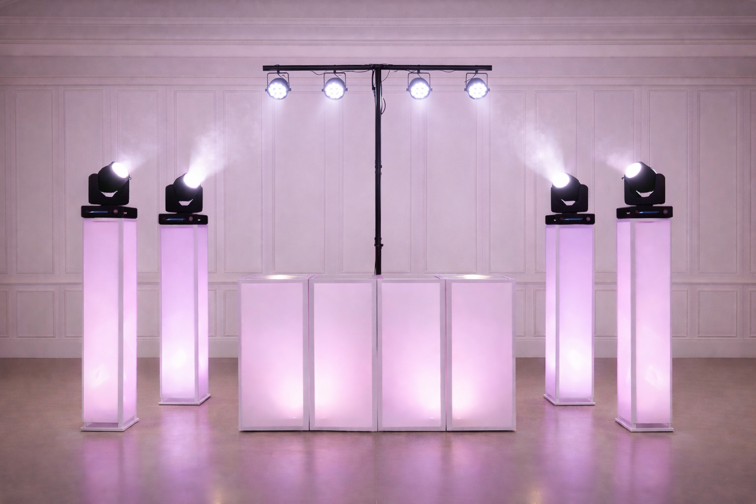 Incluye equipo de sonido estéreo de 3000w de potencia, cabina y columnas vestidas de blanco retroiluminadas, cabezas móviles y soporte central con 4 par Led, todo con múltiples efectos y colores.