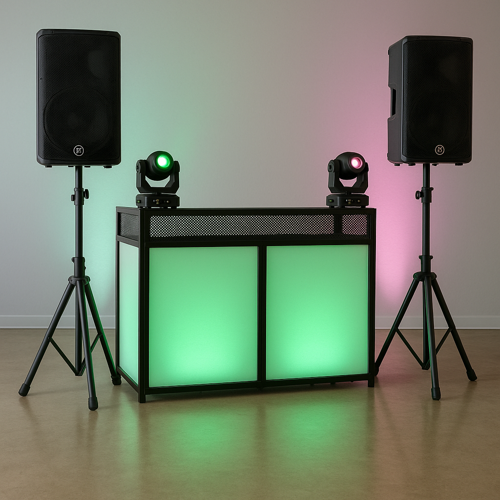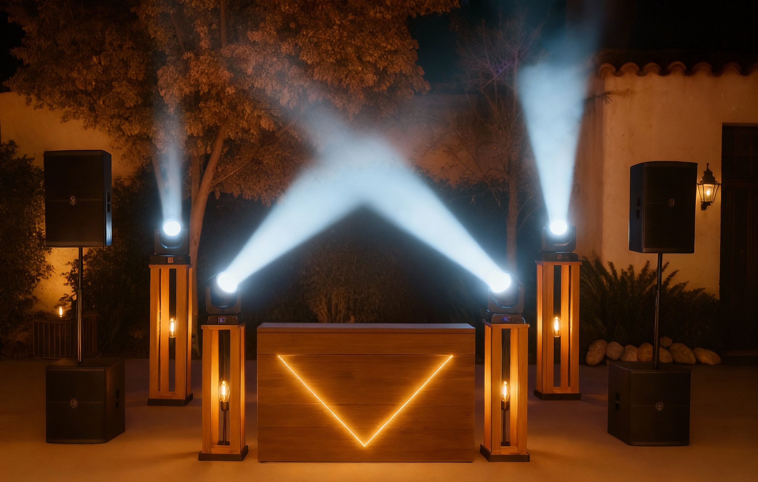 Incluye escenario de 4×4 metros, un equipo de sonido de 5.400 W de potencia, cabina DJ retroiluminada y estructura de truss de 6 metros con un conjunto de iluminación formado por focos, potentes cabezas móviles 7R y efectos derby, para cubrir el escenario de forma espectacular.